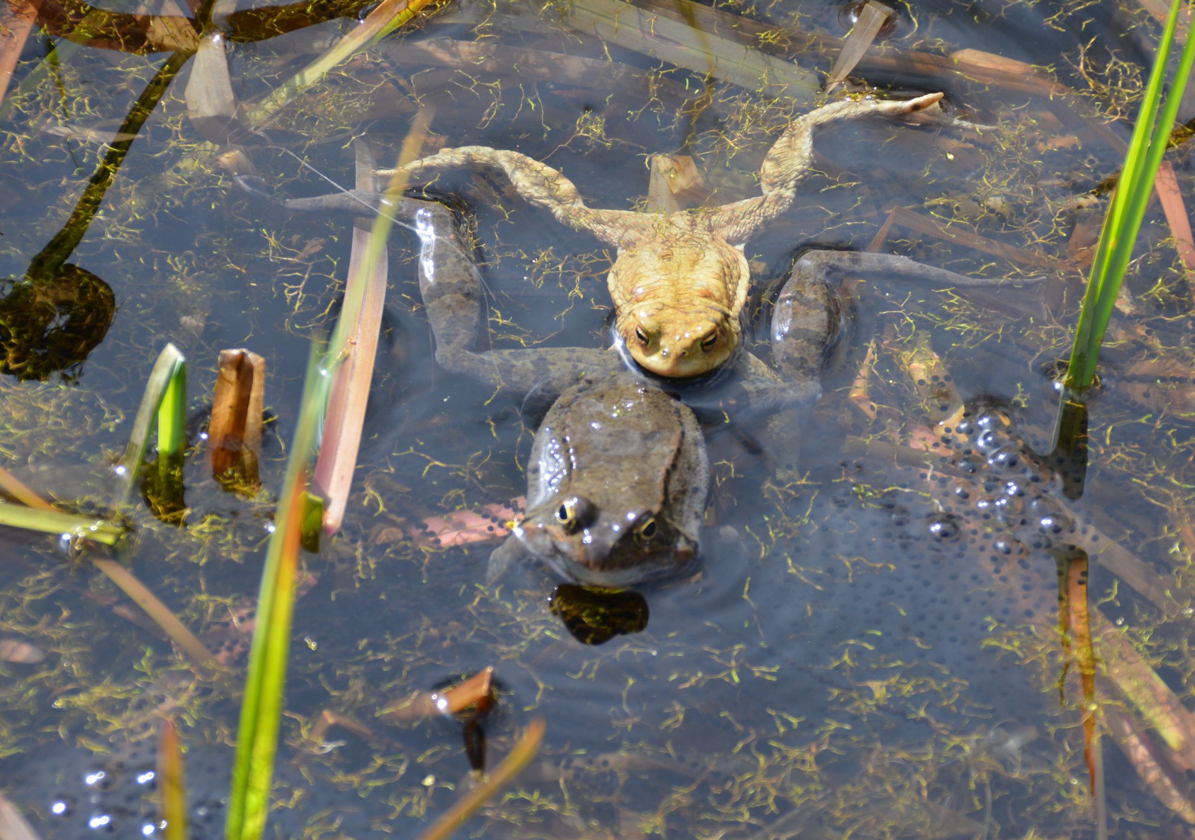 Natürliche Habitate bzw. Biotope sind eher die Minderheit. Künstlich angelegte Teiche und vor allem Gartenteiche sind wichtige Laichplätze für unser heimischen Amphibien geworden. In Wald an der Alz, im Bereich Wehrstraße zu Hambergerstraße, wurden uns durch eine aufmerksame Amphibienfreundin mehrere überfahrene Tiere gemeldet. Die Situation haben wir gemeinsam vor Ort besichtigt. Das von den Tieren angepeilte Ziel ist ein riesiger, traumhafter Gartenteich, den wir zusammen mit der Besitzerin anschauen durften. In dem Teich wimmelt es von Erdkröten, die bereits einige Laichschnüre verlegt haben.