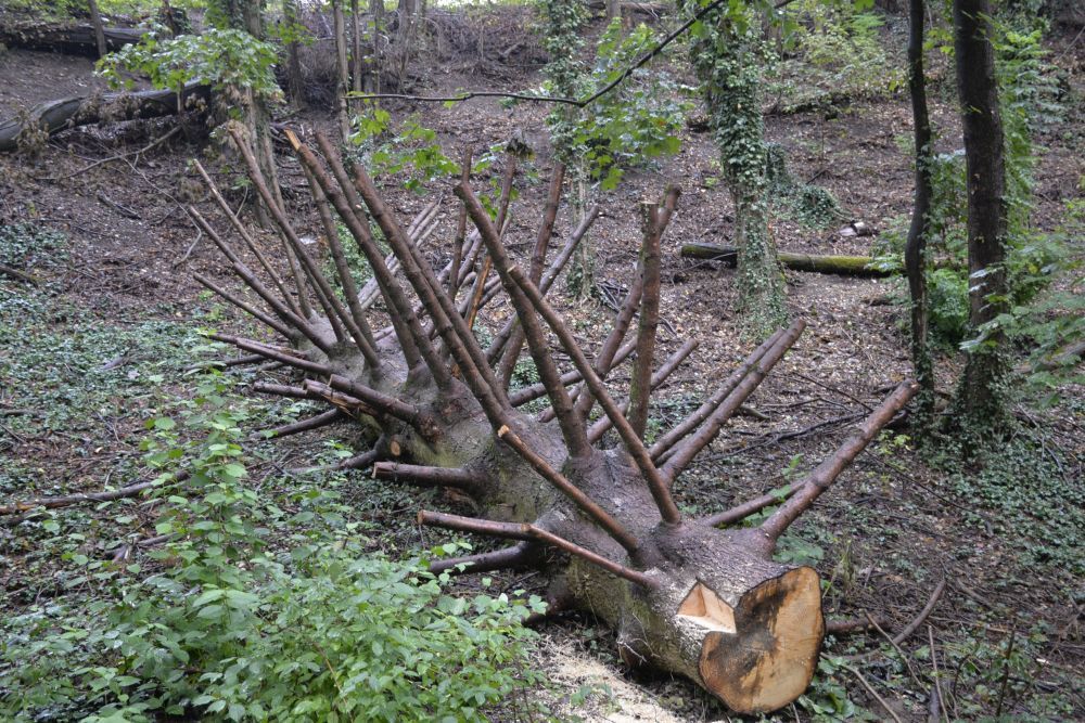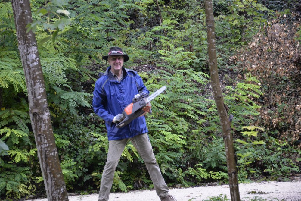 Gerhard hat am Laubtunnel die letzten Krampen eingeschlagen und die äußeren Sprossen neu, bzw. fester angeschraubt. Uwe hat den Kletterbaum in den Endzustand gebracht. Dazu mussten die vielen kleinen Ästchen, die noch abstanden und andere Äste, die nicht tragfähig waren, abgeschnitten werden. Und damit die Kleinen unter den Kletterern auch auf den Baum können, gab es unten eine kleine Extra-Stufe.