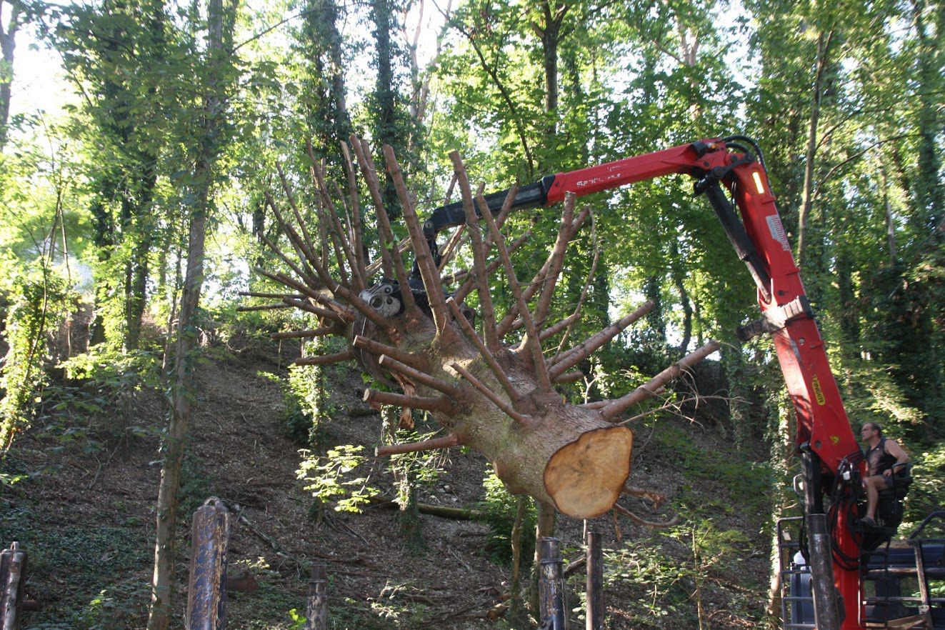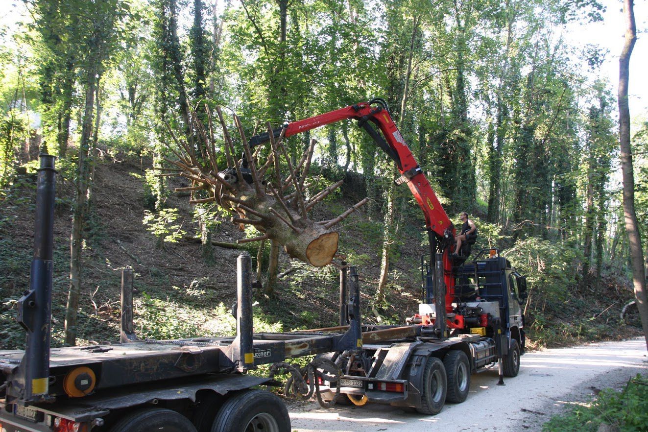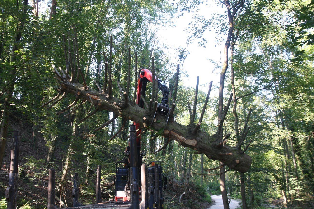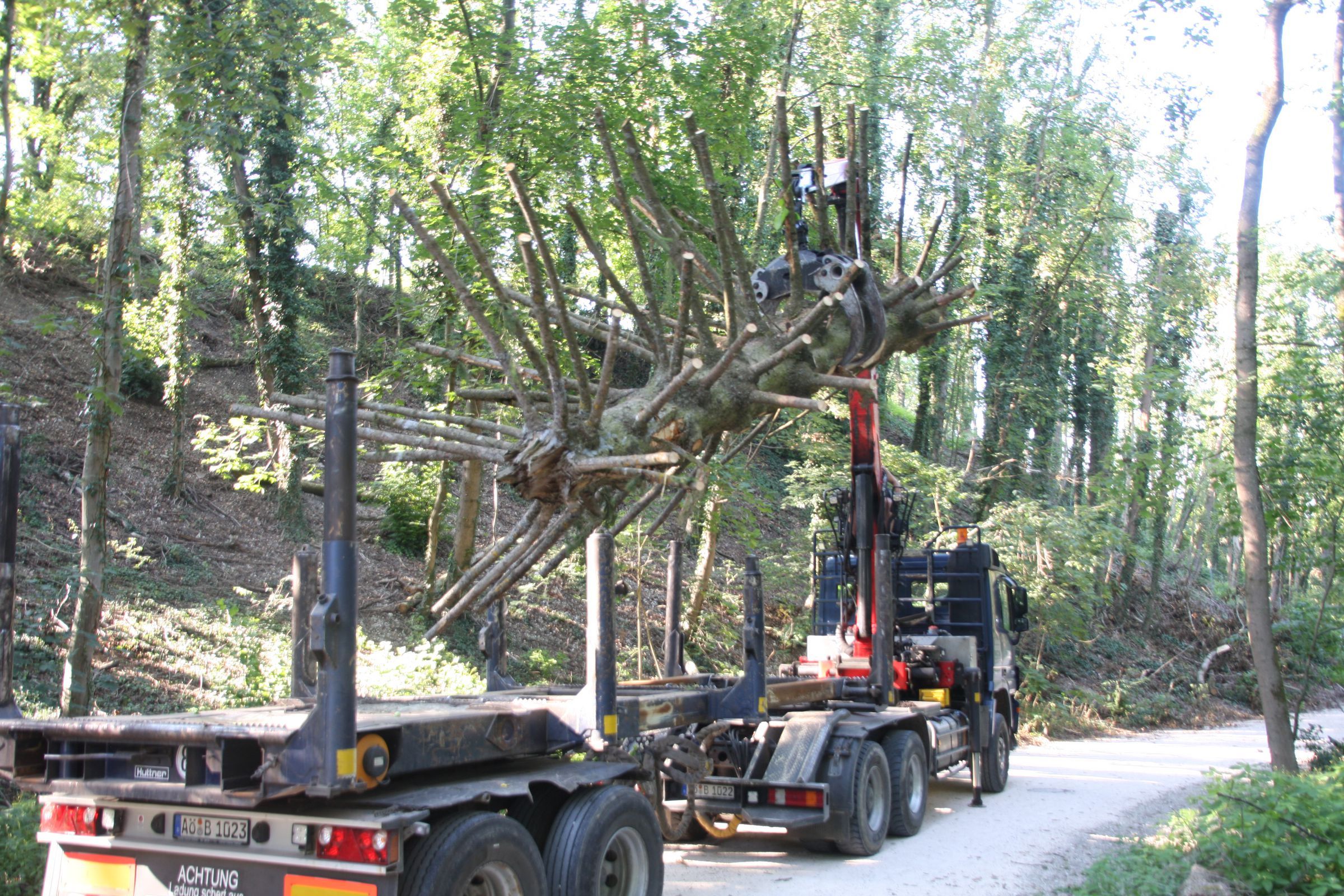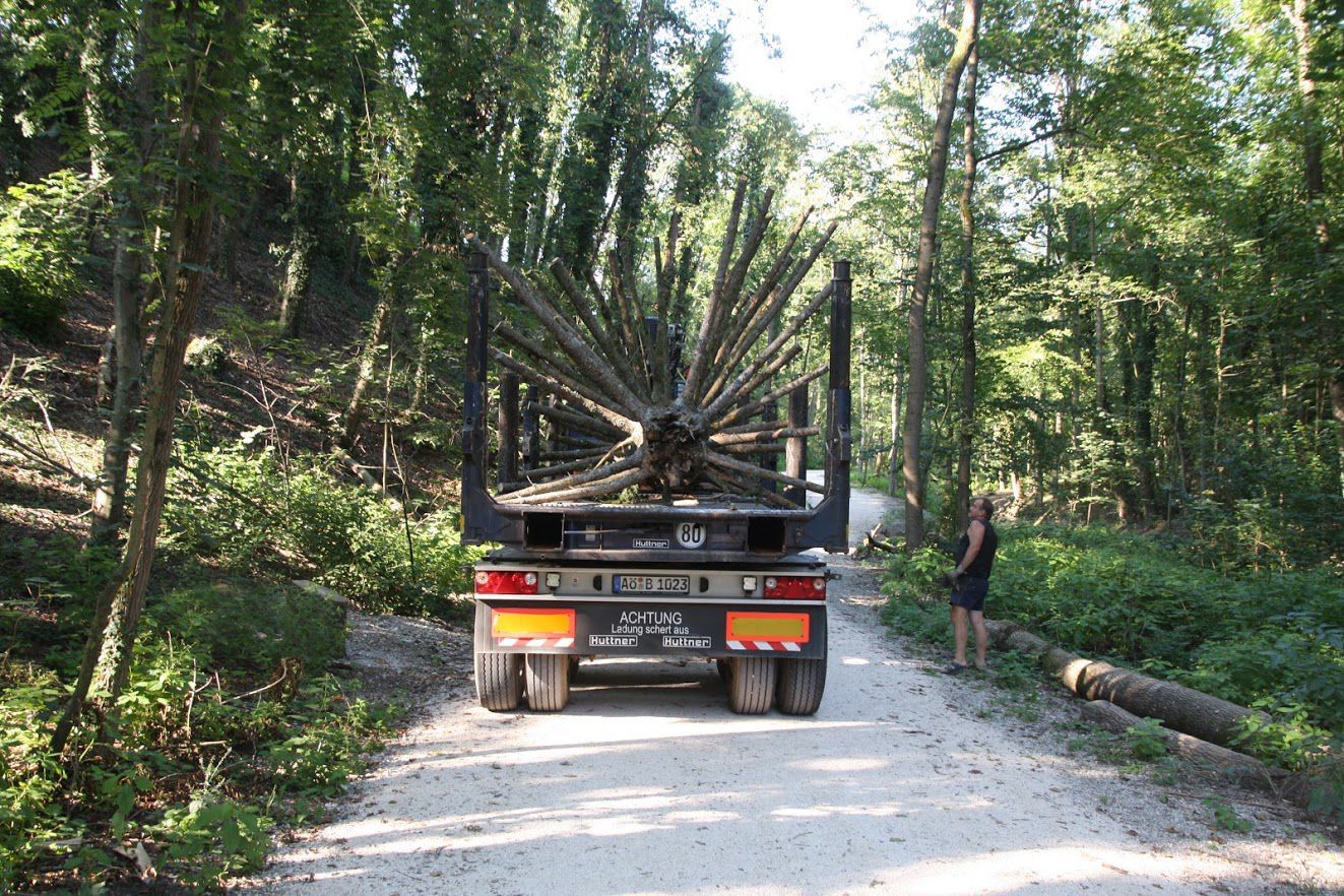 Es war ein Erlebnis, zu sehen, wie der zukünftige Kletterbaum transportiert wurde. Jetzt liegt er im Gries und wartet darauf nachbearbeitet zu werden.