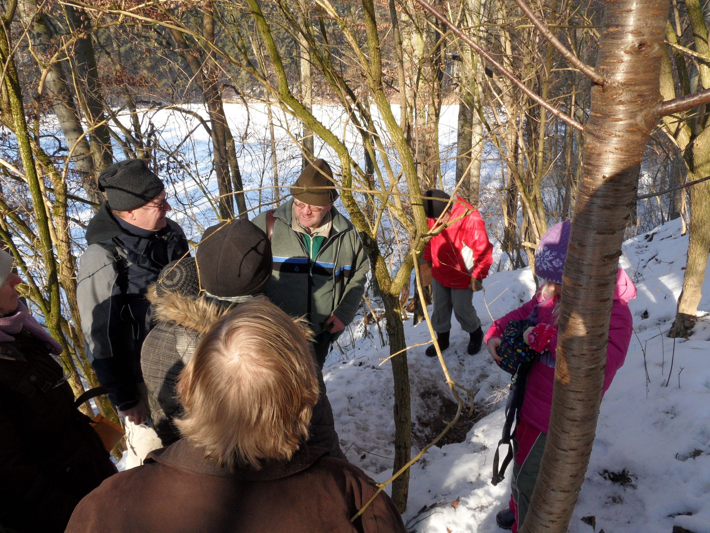 Am 11. Februar zeigte der Winter noch was er kann. Der Waldlehrpfad im Auwald bei Hohenwart hatte noch Schnee, die Wege waren teilweise vereist und der kleine Teich war weitestgehend zugefroren. Aber die Sonne schien bei 0 °C und wir bewegten uns ordentlich, sodass keiner wirklich ins Frieren kam. 24 Teilnehmer, davon 8 Kinder folgten Klaus Hell und erfuhren viel über die Natur im Wald und seine Lebewesen. Der Waldlehrpfad ist sehr schön gemacht und bietet sicher zu jeder Jahreszeit allen Besuchern Informationen aber auch schöne Natureindrücke. Speziell für Kinder wurde der Dschungelpfad mitten durchs Gehölz angelegt. Dort sollten die Tiere (die dort als Attrappen versteckt sind) gefunden und gezählt werden. Da haben alle mitgemacht auch die Großen Kinder.