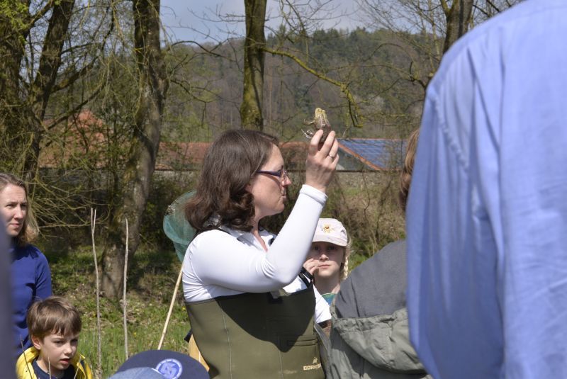 Ines Hager, erläutert im Gebiet den derzeitigen Bestand an Amphibien und Wasserinsekten.