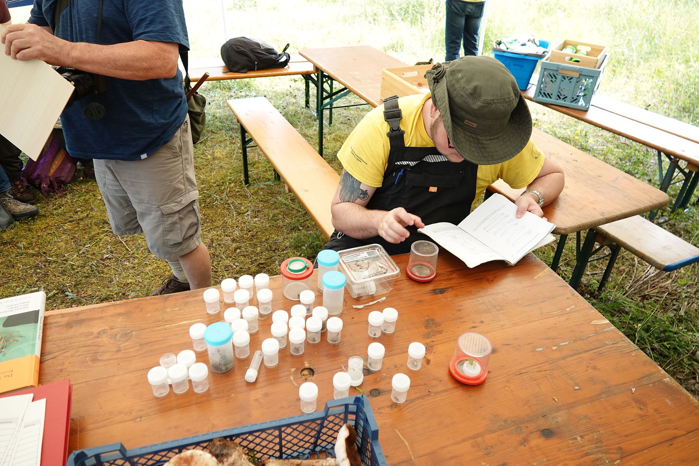 Für die Bestimmung der Nachtfalter haben Johann Brandstetter, Christian Zehentner, Stephan Stadler und Gerhard Karl Freitagabend zwei Lichttürme fachlich betreut, und Gerhard Karl hat außerdem seine Lichtfallen über Nacht hängen lassen und in der früh ausgewertet. Walter Sage und Markus Brindl haben am Samstag neben Käfern, Zikaden und Libellen die Tagfalter bestimmt. So kamen auch hier beachtliche 100 Falter-Arten zusammen. Mindestens 60 verschiedene Käfer-, Heuschrecken-, Wanzen und Zikadenarten wurden von Martin Vukusic, Stephan Stadler und Walter Sage notiert. Die Wildbienen wurden von Gerhard Karl und Daniela Ehm untersucht, da zeigte sich die üppig blühende Magerrasenfläche mit 17 Wildbienenarten als sehr ergiebig. Die 7 gefundenen Libellenarten weisen daraufhin, dass die im Gebiet angelegten kleinen Tümpel durchaus angenommen werden. Die Biologiestudenten Martin Vukusic, Erik Schabel und Elisabeth Mettler waren eigens aus Regensburg angereist um ihre Arten-Kenntnisse anzuwenden. Neben botanischen KnowHow waren das Schnecken- und Schreckenkunde bei Martin Vukusic und Ameisenkunde bei Erik Schabel. So fand letzterer 19 verschiedene Ameisenarten, darunter die Königin der Braunschwarzen Rossameise (Camponotus ligniperda). Diese Artengruppe ist damit erstmals in unseren GEO-Tags-Ergebnissen vertreten. 12 dieser 19 Ameisenarten haben bereits Rote Liste-Status. Ein Grund für die Organisatoren, diese Artengruppe weiter in den Fokus zu nehmen.