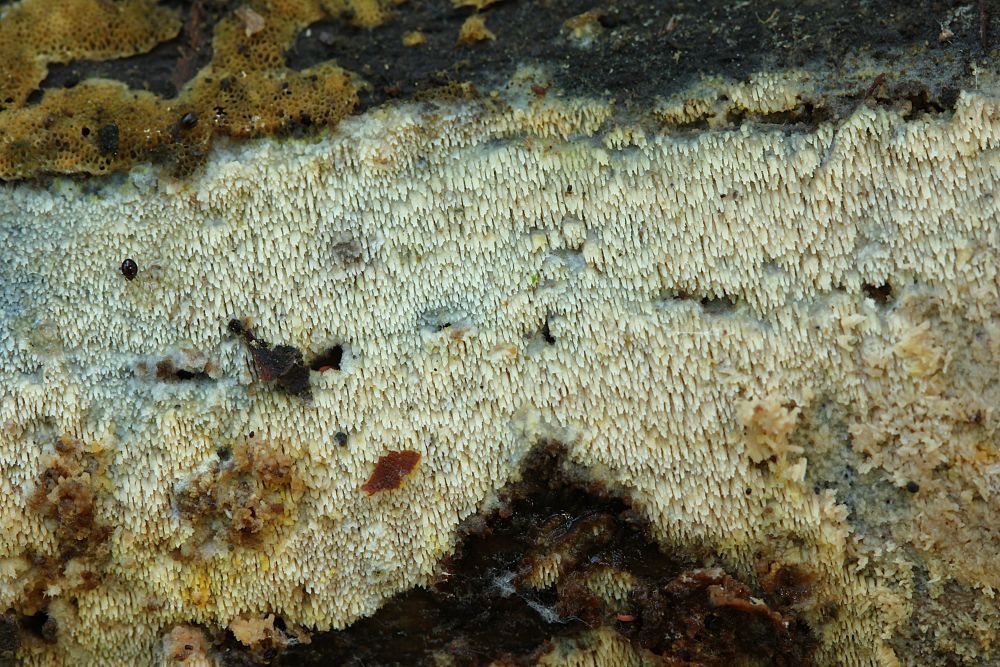 - Schwefelgelber Pleurobasidienrindenpilz (Xenasmatella vaga), leuchtend schwefelgelb, mäßig häufig